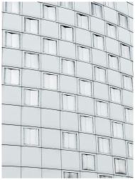 Distinctive white building facade with symmetrical windows and geometric patterns.