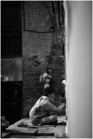 A street artist focuses on creating art on a wall in Bhaktapur, Nepal, captured in black and white.