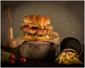 Close-up of a juicy gourmet hamburger with crispy fries on a rustic wooden surface.