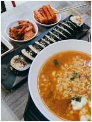 Delicious Korean meal featuring hot ramen, gimbap,