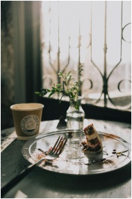 A serene moment with a slice of cake, coffee, and flowers at a rustic café by the window.