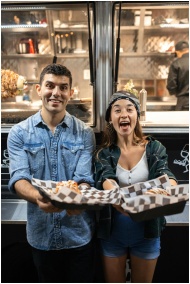 Cheerful couple with diverse backgrounds holding food at a food truck.