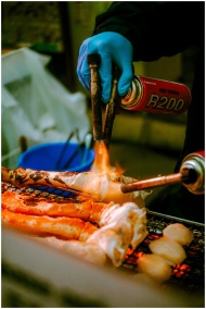 A street vendor grills fresh crab legs with blowtorches at a vibrant Osaka market. Perfect for food enthusiasts.