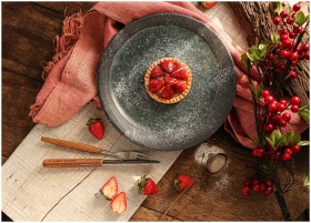 A delicious strawberry tart dusted with powdered s