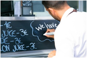 Back view of crop anonymous male worker writing information on marker board for clients of food truck