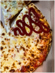 Close-up of a cheesy pizza topped with a zigzag of ketchup, showcasing melted cheese and crispy edges.