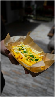 Delicious cheesy french fries topped with herbs, served in a box, handheld shot.