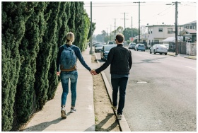 A couple walks hand in hand along a sunny sidewalk