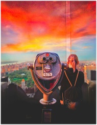 Vibrant sunset over Central Park captured from New York City observation deck with a viewfinder and female tourist.