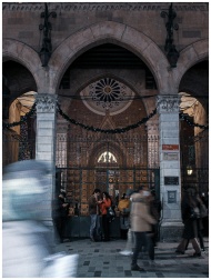 Gothic cathedral entrance with architectural details and people blurred in motion.