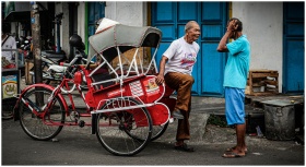 Two men in a lively conversation next to a vibrant red rickshaw on a bustling street.