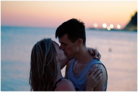 A couple shares a romantic kiss at the beach during sunset, capturing love and intimacy.