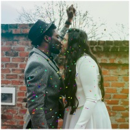 A couple celebrates their wedding with a kiss amidst colorful confetti outdoors.