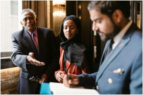 A diverse group engages in a professional meeting.