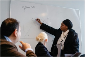 Group of multiethnic coworkers in formal wear discussing business plan and analyzing diagrams in team