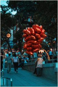 Busy urban street filled with people and a vendor selling red heart balloons at twilight.