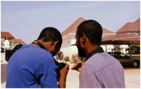 Two friends enjoy an outdoor photoshoot on a sunny