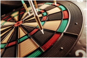 A detailed close-up of an electronic dartboard, showcasing vibrant colors and precision darts hitting the target.