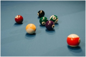 Colorful billiard balls scattered on a blue pool t