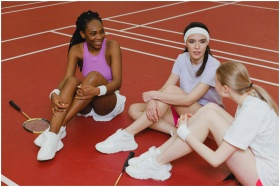 Three women on a badminton court having a friendly conversation and enjoying a break.