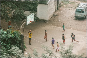Group of young men playing a casual basketball game on a rural court.