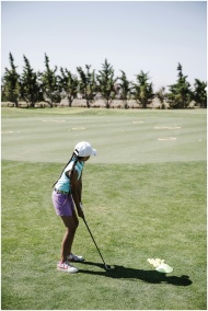 A child golfer prepares a swing on a sunny day on the golf course, showcasing youth sports.