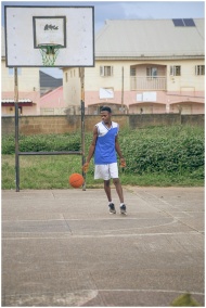 A young man dribbles a basketball on an outdoor court in Nigeria.
