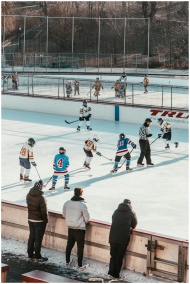 A lively youth ice hockey match at an outdoor rink in Central Park, New York City.