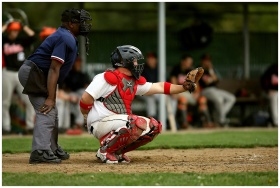 A baseball catcher and umpire in action during a game on a grassy field.