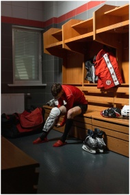 Male athlete adjusting protective gear in a locker room setting, preparing for sports.