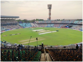 Wide-angle view of an iconic cricket stadium empty before a match, showcasing vibrant seating and green pitch.