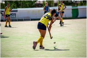 Female field hockey players in action on an outdoor grass field during a match.