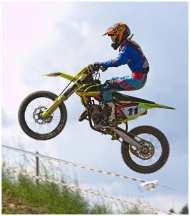 Rider performing an airborne trick on a motocross bike, showcasing speed and agility.