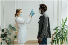 A healthcare professional checks a patient's temperature as part of pandemic protocols in a clinic setting.