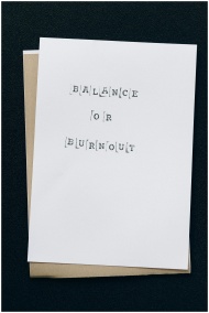 A simple card displaying the message 'Balance or Burnout' emphasizing mental health and stress management.