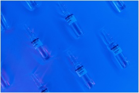 Top view of COVID-19 vaccine vials set against a bright blue background with a neon effect.