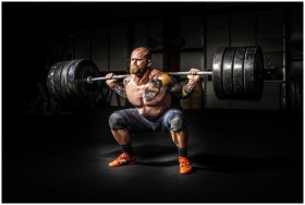 Muscular man lifting heavy weights during an intense squat session inside a gym.