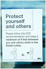 A sign displaying CDC guidelines for social distancing in a retail lobby.