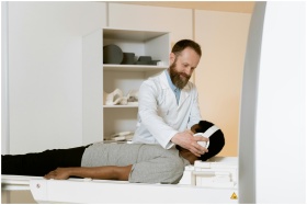 A medical professional prepares a patient for an MRI scan in a healthcare facility.
