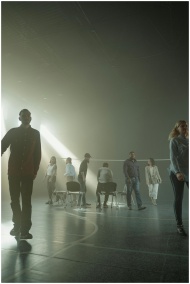A diverse group in a dimly lit gymnasium engaging in a therapy session with scattered chairs.