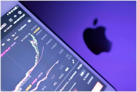 Close-up of a stock market graph on a digital device with an Apple logo in purple lighting.