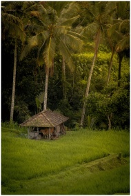 Scenic view of a rustic hut amidst tropical palm trees in a lush rice field.
