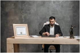 A bearded lawyer working at his office desk, showi