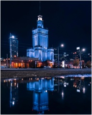Illuminated Warsaw skyline featuring the Palace of Culture and Science in the evening.