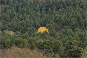 A bright yellow tree stands out in a dense, evergr