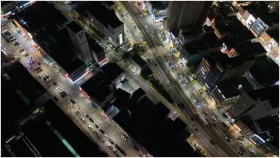 A dynamic aerial view of Busan's city streets at night, showcasing bustling urban life.