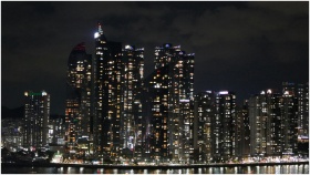 Stunning cityscape of Busan, South Korea, with illuminated skyscrapers at night.