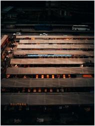 Aerial shot of bustling night market stalls in urban Bangkok, illuminated against the cityscape.