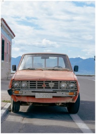 Old red car parked on street in Aegina, Greece with mountain view in background.