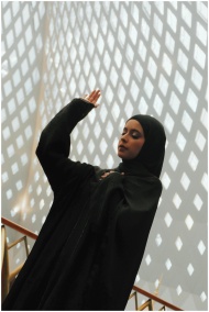 A woman in a black hijab poses elegantly with geometric patterns in the background.